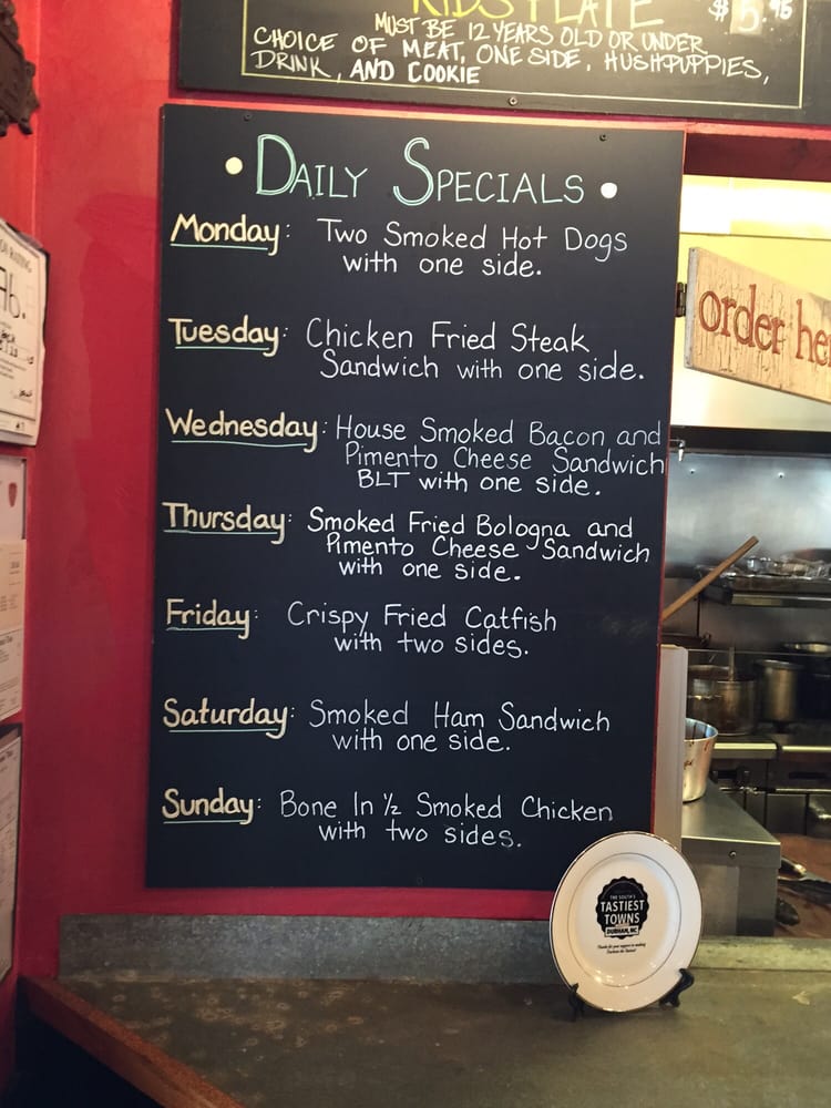 Choice of meat, one side, hushpuppies, drink, and a cookie