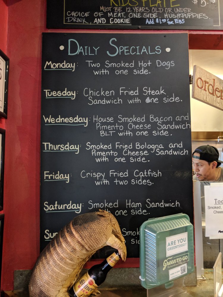 Two pounds of pork, one pound of beef, one and a half pounds of ribs, one pound of sausage, choice of three large sides, 2 large hushpuppies and a gallon of tea